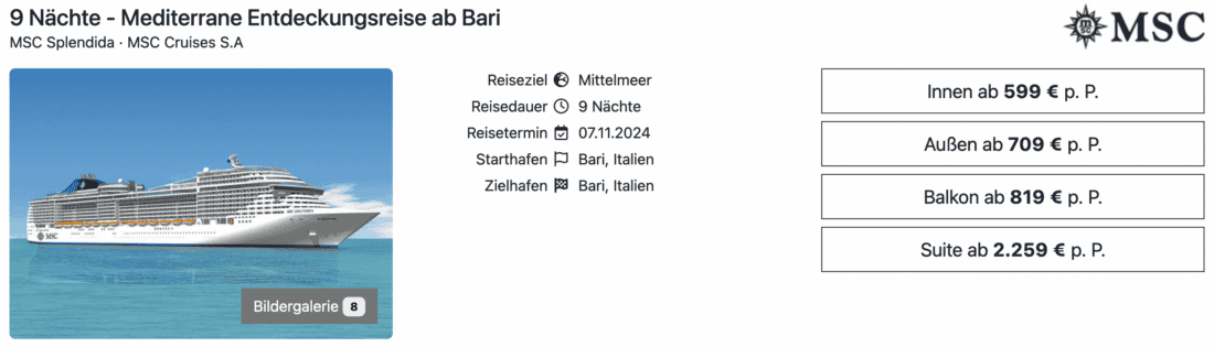 Die MSC Splendida ist im Oktober und November 2024 auf Kreuzfahrten durch das östliche Mittelmeer im Einsatz. Die Kreuzfahrt startet und endet in Bari und beinhaltet Zwischenstopps in Kroatien, Griechenland, Italien sowie der Türkei. Für die 9 Nächte zahlt ihr in einer Innenkabine momentan nur 599€ pro Person. Falls euch das nicht ausreicht, stehen natürlich auch Außenkabinen ab 709€ bzw. Balkonkabinen ab 819€ (jeweils pro Person bei Doppelbelegung) zur Verfügung.