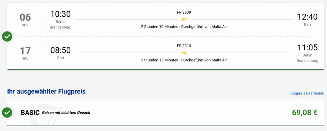 Die Kreuzfahrt startet und endet in Bari. Eine günstige Möglichkeit für die An- und Abreise sind Flüge mit Ryanair von Berlin, wobei der Hinflug am 6. November und der Rückflug am 17. November 2024 stattfindet. Diese Direktflüge könnt ihr aktuell ab 70€ (zzgl. insgesamt 46€ für 20 kg Aufgabegepäck) buchen: