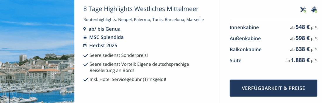 Die MSC Splendida fährt im November und Dezember 2025 ab Genua zu einigen interessanten Zielen im Mittelmeer. Diese Kreuzfahrt mit einer Dauer von 7 Nächten könnt ihr aktuell beim Seereisedienst zum besonders günstigen Preis buchen. Eine Innenkabine ist bereits ab 548€ pro Person verfügbar. Weitere Optionen sind Außenkabinen ab 598€ sowie Balkonkabinen ab 638€ (jeweils pro Person bei Doppelbelegung). Für Alleinreisende gilt dieses Angebot nicht.