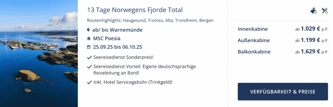Auf der MSC Poesia geht es Ende September 2025 auf eine 12-tägige Kreuzfahrt von Warnemünde, bei der verschiedene Ziele in Norwegen besucht. Aktuell gibt es die Innenkabine ab 1.029€, die Außenkabine ab 1.199€ und die Balkonkabine ab 1.629€ (jeweils pro Person). Für Alleinreisende gilt die Offerte derzeit nicht. Vollpension und Trinkgelder sind inklusive.