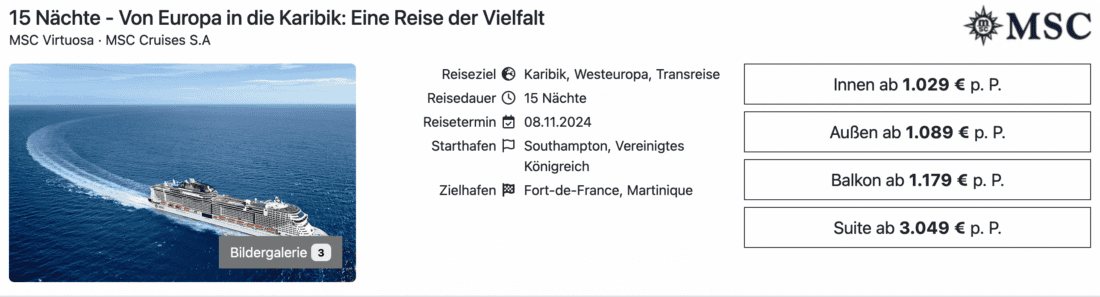Der Link zum Angebot funktioniert leider nicht. Bei direkter Buchung bei MSC liegt der Preis für die Balkon Einzelkabine bei 2606 Euro + 500 Euro Getränkepakte All Inc