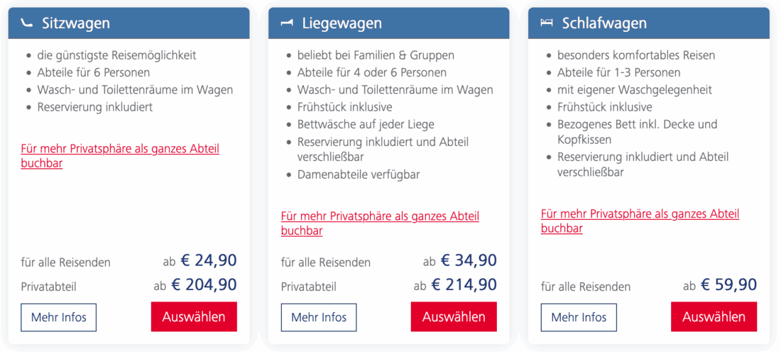 Aktuell könnt ihr euch auf diesen Strecken über die Nightjet-Webseite der ÖBB sehr preiswerte Tickets sichern. Die Preise beginnen jeweils pro Richtung bei 24,90€ im Sitzwagen, ab 34,90€ im Liegewagen oder ab 59,90€ im Schlafwagen. Ein Privatabteil im Sitzwagen könnt ihr an ausgewählten Daten ab 169,90€ buchen, was im Vergleich zu den anderen Optionen relativ teuer ist.