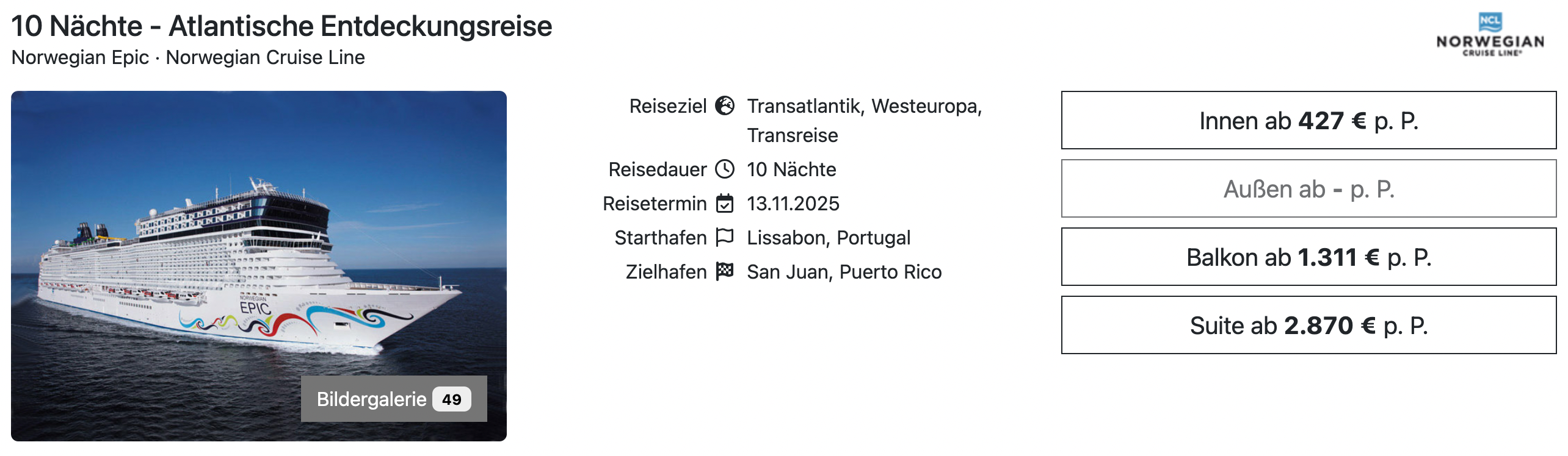 Der Deal-Button führt euch zur Transatlantik-Kreuzfahrt mit der Norwegian Epic von Lissabon nach San Juan. Diese findet vom 13. bis 23. November 2025 statt und ihr könnt euch eine Innenkabine zur Einzelbelegung bereits ab günstigen 428€ sichern.