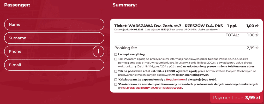 - Tickets ab 1 PLN (~0 €) + Buchungsgebühr in Höhe von 3 PLN (~1 €)