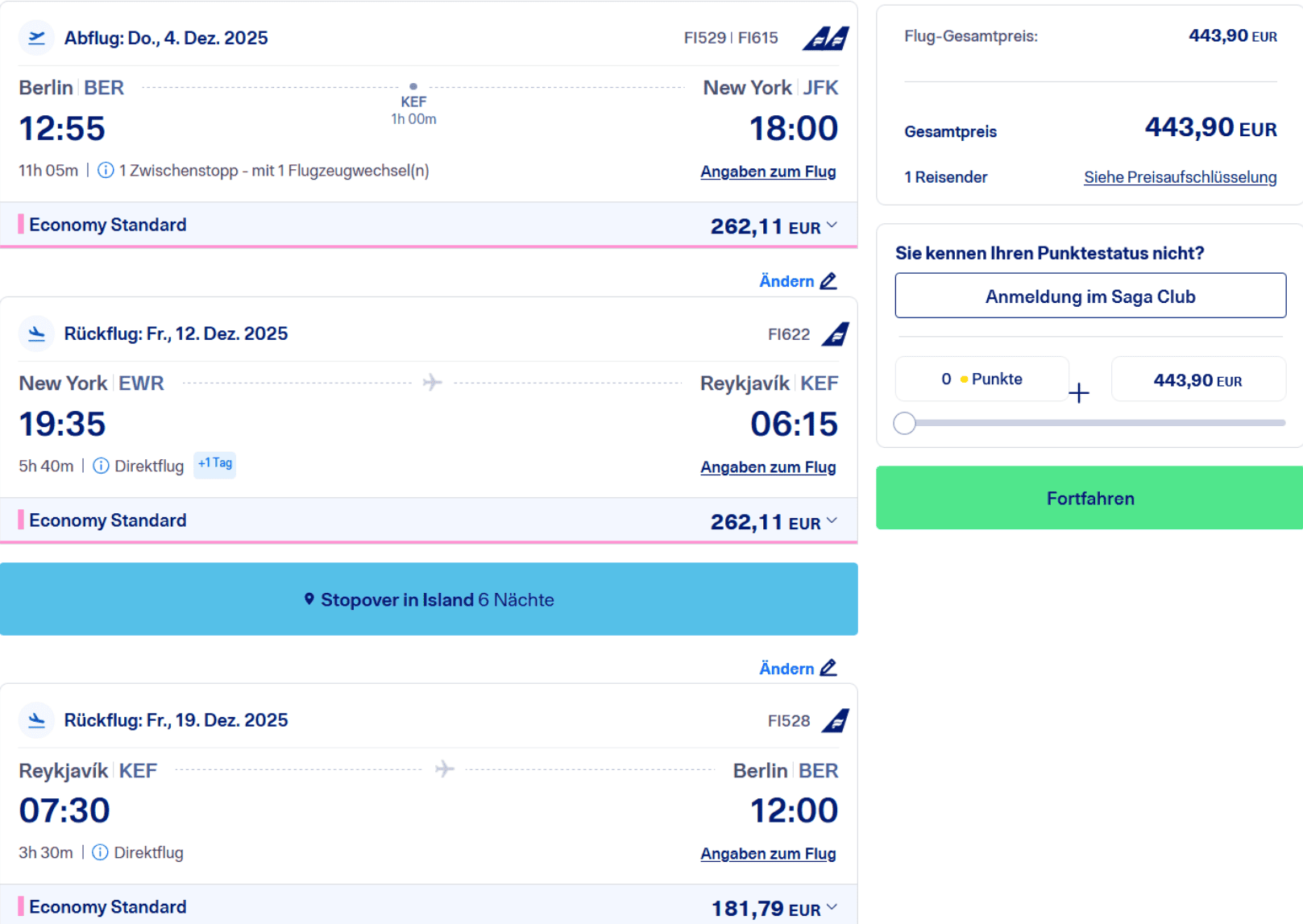 Verfügbarkeiten lassen sich für Reisen von September 2025 bis Januar 2026 finden. Hin- und Rückflug erfolgen jeweils via Reykjavik, wo gegen Aufpreis auch Stopover (max. 78 Stunden im Light-Tarif) je Richtung möglich sind. Bucht ihr den Tarif inklusive Gepäck, könnt ihr einen bis zu 7-tägigen Stopover einbauen.