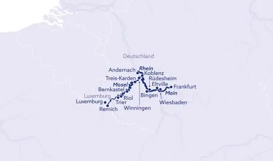 Eure Flussreise startet in Frankfurt am Main. Von dort aus nehmt ihr zunächst Kurs in Richtung Bingen am Rhein sowie die Städte Winningen und Treis-Karden. Danach geht es dann nach Trier. In der ältesten Stadt Deutschlands könnt ihr auf den Spuren der Römer wandeln. Von Remich ist es nicht weit zur Hauptstadt des Großherzogtums Luxemburg. Die Busfahrt dorthin dauert nur 40 Minuten und ist – wie der gesamte ÖPNV in Luxemburg – kostenlos.