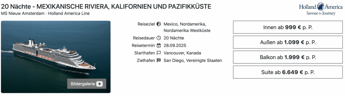 Ende September 2025 startet die Nieuw Amsterdam der Reederei Holland America Line zu einer interessanten Kreuzfahrt von Vancouver nach San Diego. Die Reise dauert insgesamt 20 Nächte und aktuell sind die Kabinen in verschiedenen Kategorien sehr erschwinglich.