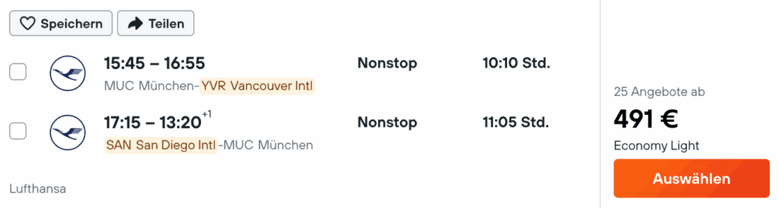 Die Kreuzfahrt startet in Vancouver und endet in San Diego. Aktuell gibt es einen günstigen Gabelflug mit Lufthansa. Diese werden ab München nonstop durchgeführt und ihr fliegt dabei am 26. September 2025 nach Vancouver, während der Rückflug am 19. Oktober 2025 von San Diego erfolgt. Diese Kombination ist aktuell bereits ab 491€ buchbar (zzgl. 135€ für 23 kg Aufgabegepäck):