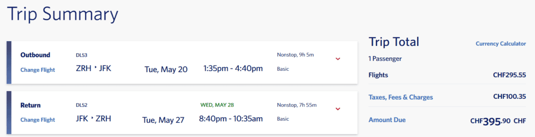 Bei allen Airlines sind Personal Item und Handgepäck inbegriffen. Als Statuskunde gibt es ggf. kostenfreies Aufgabegepäck, alle anderen müssen dafür Aufpreis zahlen. Bei den Delta-Flügen nach New York kostet der Tarif mit 23 kg Gepäck dann 523 CHF (~560 €)