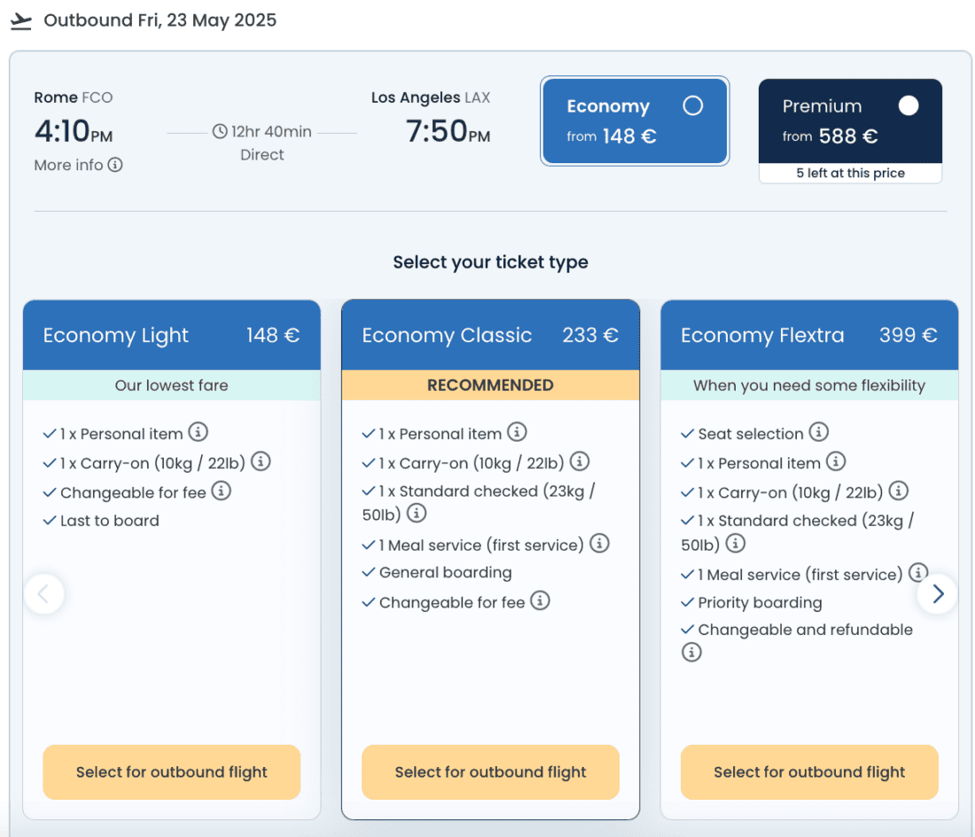 Der Flug von Rom nach Los Angeles erfolgt nonstop und wird mit Flugzeugen des Typs Boeing 787-9 durchgeführt. In der Economy Class gibt es insgesamt 282 Sitzplätze, die in einer 3-3-3 Konfiguration angeordnet sind. Die Beinfreiheit auf diesem knapp 13-stündigen Flug beträgt durchschnittlich 79 Zentimeter. Gegen einen Aufpreis von 111€ (vorbehaltlich Änderungen) habt ihr die Möglichkeit, einen Sitzplatz am Notausgang mit mehr Beinfreiheit zu buchen.