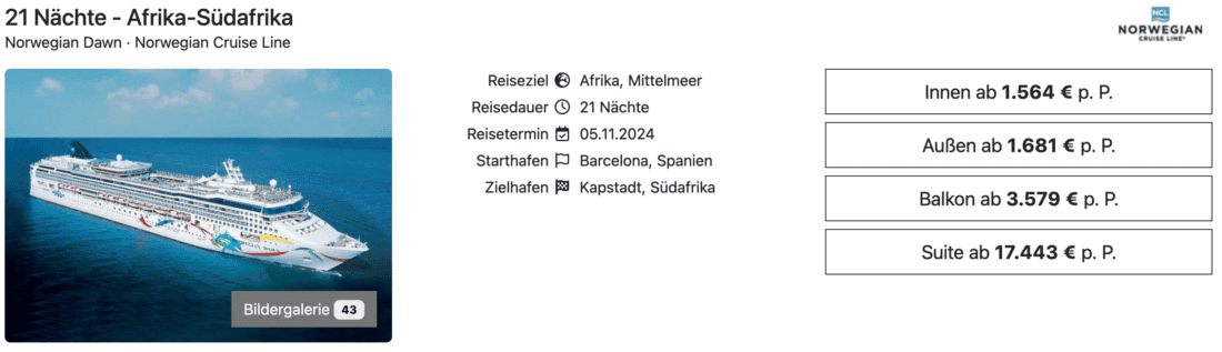 Die Norwegian Dawn schippert mit Abfahrt am 5. November in 22 Tagen von Barcelona nach Kapstadt. Die Route ist spannend, die Preise ebenfalls. In der Innenkabine geht es ab 1.564€ los, in der Außenkabine ab 1.681€ und in der Balkonkabine ab 3.579€ (jeweils pro Person). Alleinreisende sind ab 2.742€ dabei. Vollpension ist inklusive.