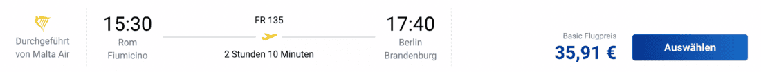 Einen günstigen Rückflug von Rom gibt es beispielsweise mit Ryanair am 10. April 2025 nach Berlin. Diese Verbindung ist momentan ab 36€ (zzgl. 28€ für 20 kg Aufgabegepäck) buchbar: