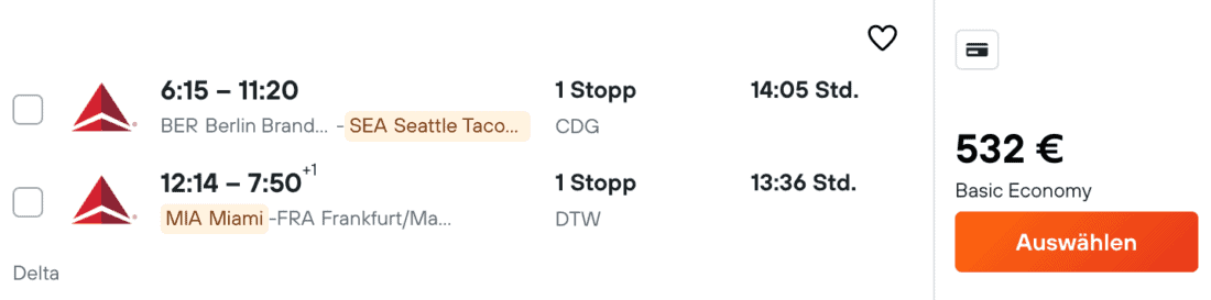 Die Kreuzfahrt startet in Seattle und endet in Miami. Deshalb ist in diesem Fall ein Gabelflug für die An- und Abreise notwendig. Ein Beispiel sind Flüge mit Air France von Berlin nach Seattle auf dem Hinflug sowie mit Delta von Miami nach Frankfurt auf dem Rückflug. Diese Verbindung ist aktuell ab 532€ (zzgl. 128€ für Aufgabegepäck) buchbar: