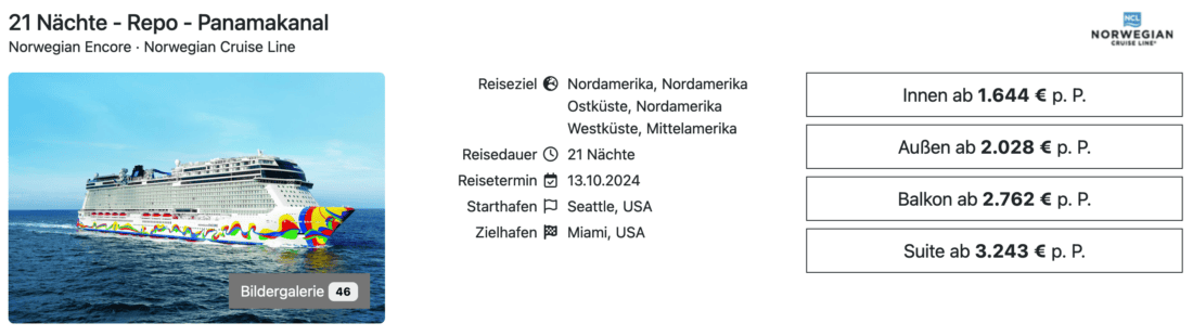 Die Norwegian Encore der US-Reederei Norwegian Cruise Line wird im Oktober 2024 auf einer dreiwöchigen Kreuzfahrt von Seattle nach Miami eingesetzt. Dabei wird auch der berühmte Panamakanal durchquert. Aktuell könnt ihr diese Kreuzfahrt relativ günstig buchen, denn für 21 Nächte in der Innenkabine zahlt ihr momentan nur 1.644€ pro Person. Weitere Optionen sind Außenkabinen ab 2.028€ sowie Balkonkabinen ab 2.762€ (jeweils pro Person bei Doppelbelegung).