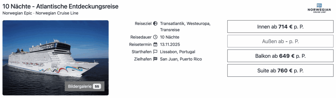Die Norwegian Epic der US-Reederei Norwegian Cruise Line ist auch in der aktuellen Sommersaison wieder in Europa unterwegs und fährt dabei zu verschiedenen Zielen im Mittelmeer. Mitte November 2025 verlässt das Schiff diese Region allerdings und wird nach San Juan in Puerto Rico positioniert.