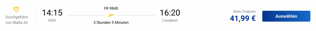 Die Kreuzfahrt startet in Lissabon und endet in San Juan auf Puerto Rico. Für die Anreise nach Portugal gibt es viele Optionen. Einen günstigen Direktflug könnt ihr u.a. mit Ryanair am 12. November 2025 von Köln bereits ab 42€ (zzgl. 26€ für 20 kg Aufgabegepäck)buchen: