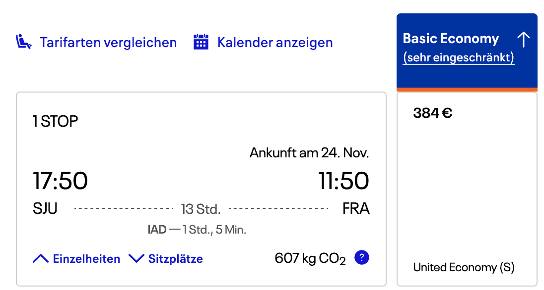 Nach Ankunft in San Juan steht der Rückflug nach Deutschland an. Eine Möglichkeit ist die Verbindung mit United Airlines nach Frankfurt, die ihr aktuell ab 384€ (zzgl. 87€ für Aufgabegepäck und Sitzplatzreservierung) buchen könnt:
