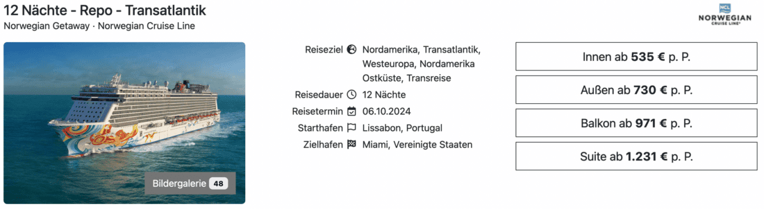 Die Norwegian Getaway der US-Reederei Norwegian Cruise Line verlässt im Oktober 2024 die europäischen Gewässer und startet zu einer Fahrt über den Atlantik. Die Reise von Lissabon nach Miami mit einer Dauer von 12 Nächten wird aktuell sehr günstig angeboten. In einer Innenkabine seid ihr ab 535€ pro Person dabei. Weitere Optionen sind Außenkabinen ab 730€ sowie Balkonkabinen ab 971€ (jeweils pro Person bei Doppelbelegung).