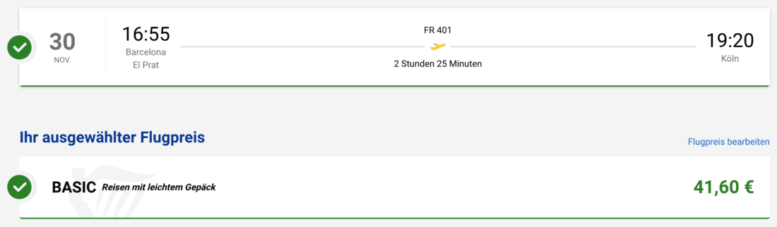 Nach Ankunft in Barcelona gibt es zahlreiche Optionen für euren Rückflug. Ein Beispiel ist die Verbindung mit Ryanair am 30. November 2024 nach Köln. Dieser Flug ist momentan ab 42€ (zzgl. 24€ für 20 kg Aufgabegepäck) buchbar: