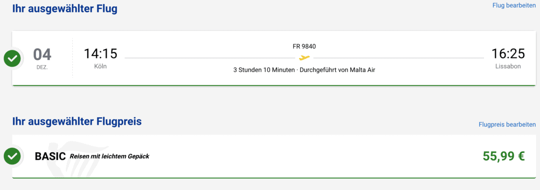 Die Kreuzfahrt beginnt in Lissabon und endet in Buenos Aires. Für den Hinflug könnt ihr etwa die Direktverbindung mit Ryanair am 4. Dezember 2024 von Köln nutzen. Dieser Flug ist aktuell ab 56€ (zzgl. 29€ für 20 kg Aufgabegepäck) buchbar:
