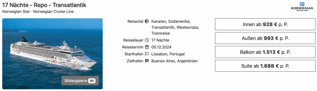 Die Norwegian Star der US-Reederei Norwegian Cruise Line wird im Dezember 2024 von Portugal nach Argentinien überführt, da das Schiff in der kommenden Wintersaison in Südamerika stationiert ist. Aktuell könnt ihr die Atlantiküberquerung von Lissabon nach Buenos Aires zu fairen Preisen buchen. Für 17 Nächte in einer Innenkabine zahlt ihr 928€ pro Person. Ebenfalls verfügbar sind Außenkabinen ab 993€ sowie Balkonkabinen ab 1.513€ (jeweils pro Person bei Doppelbelegung).