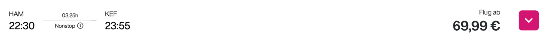 Die Kreuzfahrt startet in Reykjavik und endet in Oslo, daher sind in diesem Fall zwei Oneway-Flüge erforderlich. Eine günstige Möglichkeit für die Anreise nach Island ist beispielsweise ein Flug mit Eurowings am 29. August 2024 von Hamburg, welcher aktuell ab 70€ (zzgl. 29€ für 23 kg Aufgabegepäck) buchbar ist: