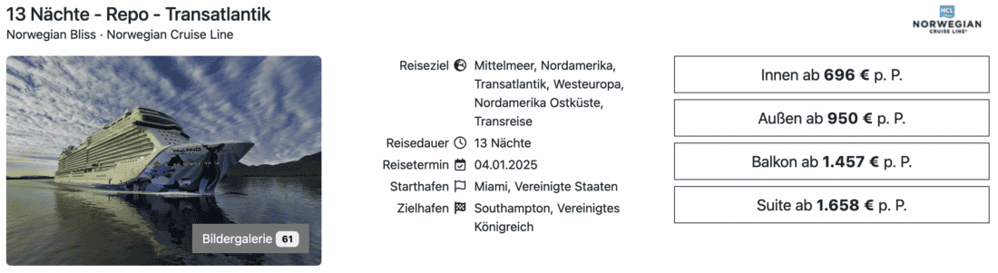 Die Norwegian Bliss der US-Reederei Norwegian Cruise Line wird Anfang Januar 2025 auf einer Transatlantik-Kreuzfahrt von Miami nach Southampton eingesetzt. Für diese Reise mit einer Dauer von 13 Nächten könnt ihr eine Innenkabine ab 696€ pro Person buchen. Die Außenkabinen sind ab 950€ zu haben, die Balkonkabinen ab 1.457€ (jeweils pro Person bei Doppelbelegung).