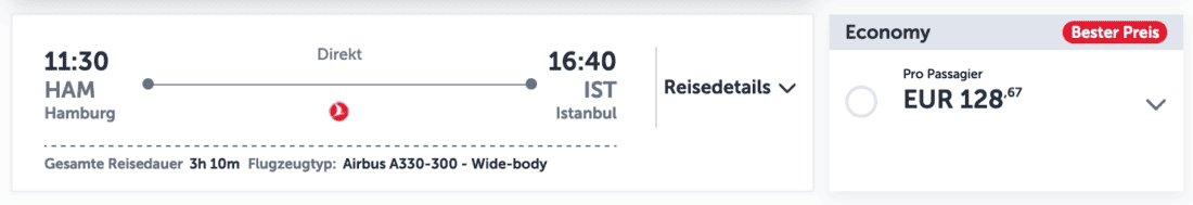 Die Kreuzfahrt startet in Istanbul und endet in Barcelona. Für die An- und Abreise sind daher zwei Oneway-Flüge die günstigste Alternative. Für die Anreise könnt ihr den Direktflug mit Turkish Airlines am 19. November 2025 von Hamburg nutzen, welcher momentan ab 129€ (zzgl. 18€ für 23 kg Aufgabegepäck)buchbar ist: