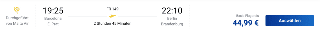 Nach Ankunft in Barcelona gibt es verschiedene Optionen für den Rückflug. Ein Beispiel ist die Verbindung mit Ryanair nach Berlin am 2. Dezember 2025, die ihr ab 45€ (zzgl. 34€ für 20 kg Aufgabegepäck) buchen könnt:
