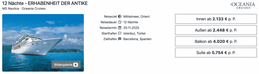 Die Oceania Nautica der Luxusreederei Oceania Cruises fährt im November 2025 von Istanbul nach Barcelona und legt dabei mehrere Zwischenstopps in der Türkei, Griechenland, Italien und Frankreich ein. Aktuell könnt ihr euch diese Kreuzfahrt mit einer Dauer von 12 Nächten inkl. Kabinenupgrade sichern. Die günstigste Innenkabine kostet 2.133€ pro Person. Die Außenkabinen sind ab 2.448€ verfügbar, während ihr für eine Kabine mit Balkon mindestens 4.020€ pro Person investieren müsst (jeweils pro Person bei Doppelbelegung). Für Alleinreisende gilt das Angebot leider nicht.