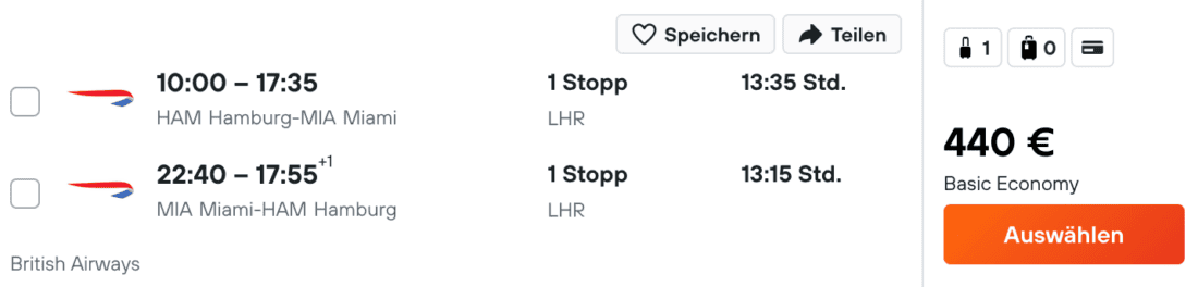 Unsere Empfehlung ist die Buchung eines Hin- und Rückfluges nach Miami mit British Airways. Mit Hinflug von Hamburg am 11. Dezember und Rückflug am 23. Dezember 2024 ist dies momentan ab 440€ (zzgl. 150€ für 23 kg Aufgabegepäck) buchbar:
