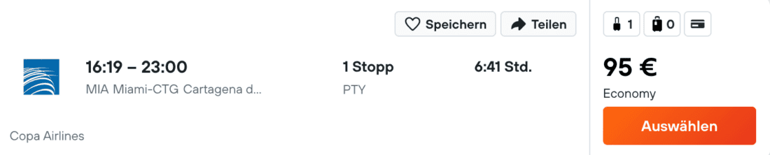 Dann benötigt ihr nur noch einen Oneway-Flug von Miami nach Cartagena. Hier könnt ihr am 12. Dezember 2024 mit Copa Airlines bereits ab 95€ (zzgl. 36€ für Aufgabegepäck) fliegen: