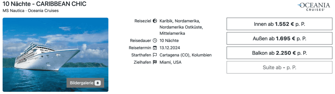 Die Oceania Nautica der Luxusreederei Oceania Cruises ist im Dezember 2024 auf einer Kreuzfahrt vom kolumbianischen Cartagena nach Miami im Einsatz. Aktuell könnt ihr euch diese Kreuzfahrt mit einer Dauer von 10 Nächten in einer Innenkabine bereits ab 1.552€ pro Person sichern. Falls euch das nicht ausreicht, gibt es selbstverständlich auch die Möglichkeit, Außenkabinen ab 1.695€ sowie Balkonkabinen ab 2.250€ (jeweils pro Person bei Doppelbelegung) zu buchen.