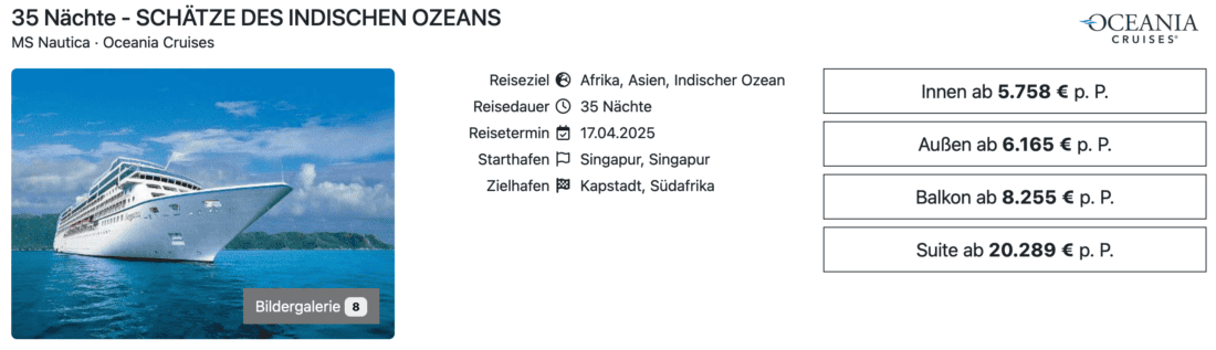 Die Nautica der US-Reederei Oceania Cruises wird im April 2025 von Singapur nach Europa überführt. In diesem Zusammenhang ist auch die Teilstrecke nach Kapstadt buchbar, welche mehrere Zwischenstopps in Malaysia, Thailand, Sri Lanka, Indien, auf den Malediven, Seychellen, Madagaskar sowie Mosambik und Südafrika umfasst.