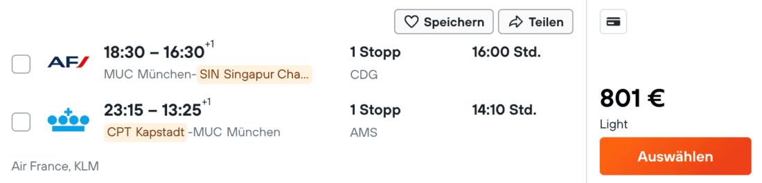 Die Kreuzfahrt startet in Singapur und endet nach fünf Wochen in Kapstadt. Einen günstigen Gabelflug könnt ihr beispielweise über Air France und KLM buchen. Dabei geht es am 15. April 2025 von München nach Singapur und der Rückflug startet am 24. Mai 2025 von Kapstadt. Diese Kombination ist momentan ab 801€ (zzgl. 115€ für 23 kg Aufgabegepäck) buchbar: