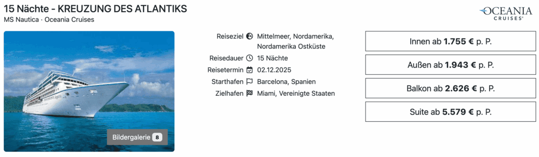 Die Oceania Nautica der US-Reederei Oceania Cruises sticht Anfang Dezember 2025 zu einer Atlantiküberquerung in See und fährt dabei von Barcelona nach Miami. Aktuell habt ihr die Möglichkeit, euch diese Kreuzfahrt auf dem Luxusschiff zu günstigen Preisen zu sichern. Für 12 Nächte in einer Innenkabine zahlt ihr momentan nur 1.755€ pro Person.