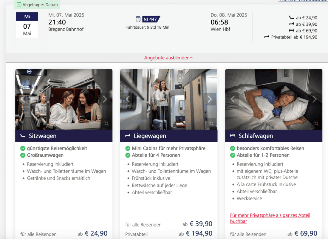 Die ÖBB betreibt seit einiger Zeit einen Nachtzug zwischen Bregenz am Bodensee und Wien, der Hauptstadt Österreichs. Mittlerweile wurde diese Strecke auf das neue Nightjet-Wagenmaterial der 2. Generation umgestellt und Tickets könnt ihr euch dafür aktuell preiswert sichern: