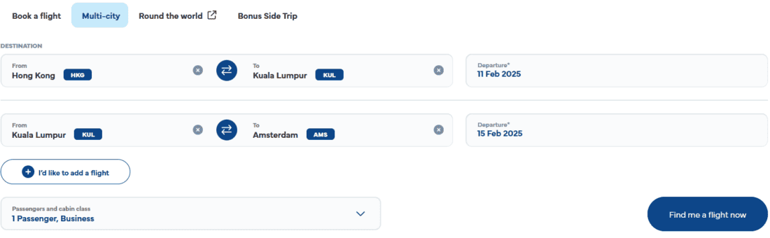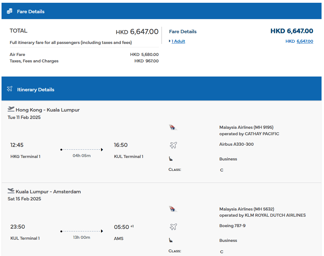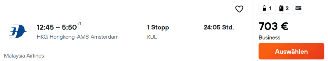 Von Malaysia Airlines gibt es einen attraktiven Business-Class-Tarif auf der Strecke Hongkong → Amsterdam. Oneway-Tickets werden zu Preisen ab 703€ angeboten, sodass sich das Ganze perfekt als Weltreisebaustein eignet.