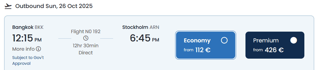 Norse Atlantic wird im Winterflugplan von Stockholm & Oslo nach Thailand fliegen. Wer zum Beginn der Saison von Asien nach Europa möchte, findet Oneway-Tickets ab 112€ mit 10 kg Handgepäck & Personal Item. Verfügbarkeiten gibt es für Oktober & November 2025.