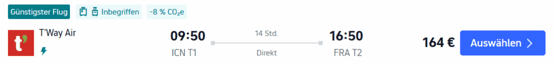 Billigflieger T’way hat wieder Flüge von Seoul nach Frankfurt im Angebot. Geflogen wird nonstop im Airbus A330 (81 cm Sitzabstand). Es gibt Verfügbarkeiten für September bis Dezember 2025, zu Preisen ab 164€ (trip.com) bzw. 178 (bei T’way).