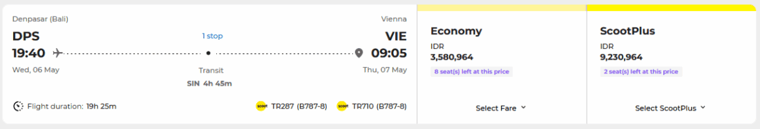 Scoot hat verschiedene Tickets von Südostasien nach Wien reduziert. Leider ist der Komfort auf der Langstrecke unterdurchschnittlich, es gibt nicht mal eine Kopfstütze. Dafür gibt es Verfügbarkeiten von September 2025 bis Mai 2026 (je nach Strecke abweichend).