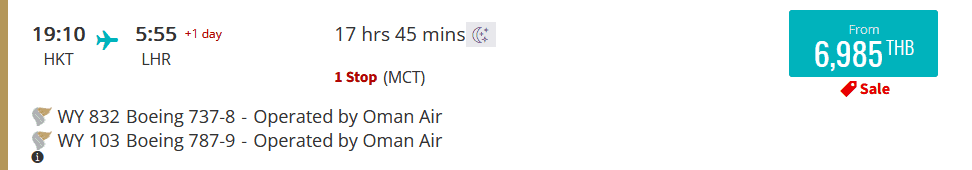 Interessant ist auch das Angebot für Flüge von Phuket nach London mit dem (frischen) Oneworld-Mitglied Oman Air. Verfügbar ist der Deal für Reisen von August 2025 bis April 2026. Standardmäßig ist nur Handgepäck inkludiert, aber der Tarif mit 20 kg Gepäck kostet nur wenig mehr.