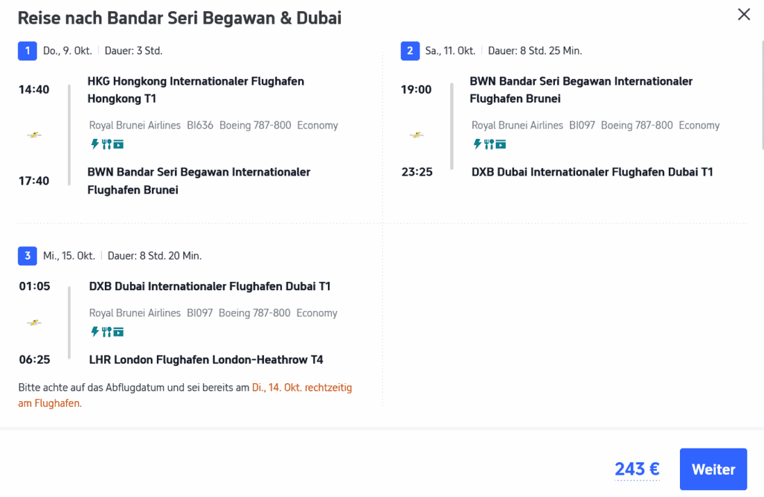 Wir reden hier ja sowieso über Weltreisebausteine. Also wieso nicht Stopps in Brunei und Dubai einlegen, wenn man schon vorbeikommt? Zudem ist der Sitzabstand mit 84 cm ziemlich großzügig und es gibt 20 kg Freigepäck. Der Preis gilt für Oktober 2025 bis März 2026.