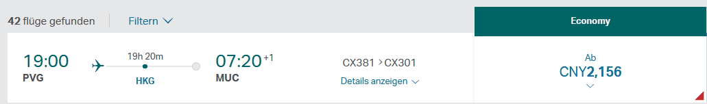 Eines der günstigsten Angebote von China in den D-A-CH-Raum kommt vom Oneworld-Mitglied Cathay Pacific. Verfügbar für Reisen von Oktober bis Dezember 2025 und inklusive 23 kg Freigepäck: