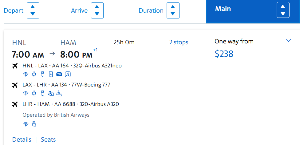 Für das Beispiel von Honolulu nach Hamburg mit American gäbe es demnach: