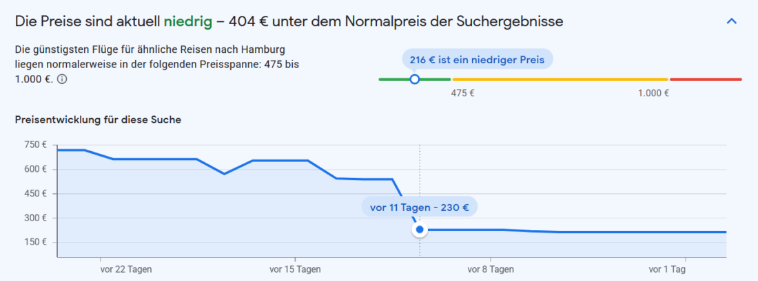 Wie lange die Preise halten, steht nicht in den Fare Rules. Vor zwei Wochen lagen die Preise aber noch deutlich höher, wie der Preisverlauf bei Google Flights (Honolulu – Hamburg) zeigt: