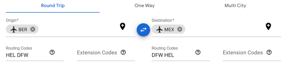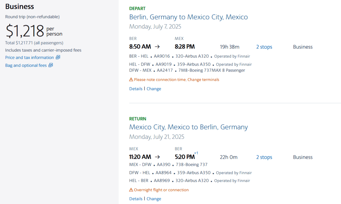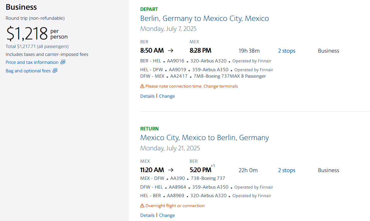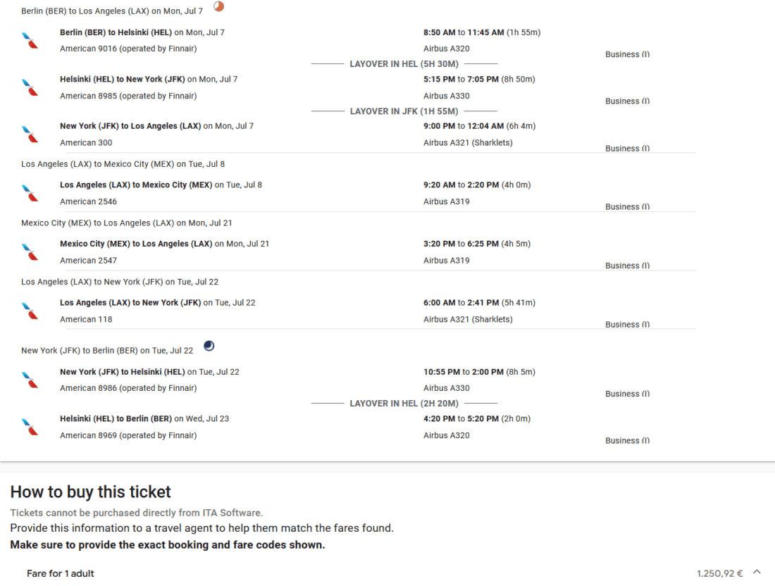 Die Tickets werden in Buchungsklasse I ausgestellt. Fliegt ihr wie im Beispiel oben BER - HEL - DFW - MEX