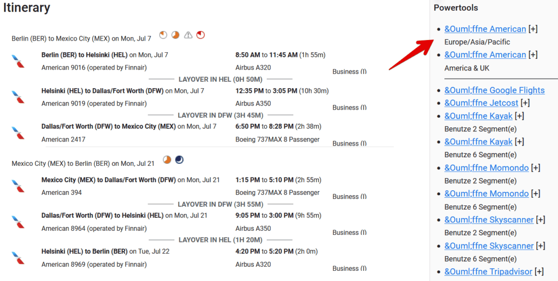 Dann gibt es aber noch einen Haken, denn eine Buchung direkt über die Matrix ist nicht möglich. Das lässt sich mit Installation der Browser-Erweiterung ITA Matrix Powertools umgehen. Dann findet sich eine Weiterleitung zu AA in der Sidebar: