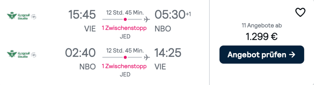 Mit Abflug von Wien verkauft Saudia bezahlbare Tickets für Business Class Flüge nach Ostafrika. Ihr erreicht den Kenia ab 1.299€. Verfügbarkeiten für Reisen nach Nairobi gibt es von April bis Oktober. Hin- und Rückflug erfolgen stets via Jeddah.