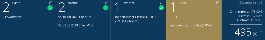 Während ihr bei Travelcircus pro Nacht mit Halbpension 137,50€ (inkl. aller Gebühren und Abgaben) bezahlt, müsst ihr für die gleichen Inklusivleistungen direkt beim Hotel mindestens 247,50€ pro Nacht bezahlen (Beispiel 6. bis 8. August 2023). Diese Rate ist dann allerdings auch bis 2 Tage vor Anreise kostenfrei stornierbar.